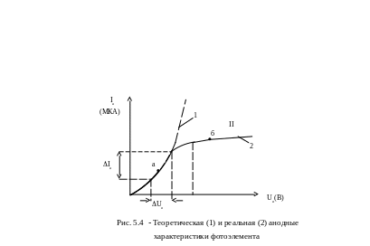 На рис. 5.4 кривая 1 – это теоретическая вольт-амперная характеристика диодного промежутка, рассчитанная по закону степени 3/2. Эта характеристика выходит из нуля и уходит в сторону больших токов и напряжений. Кривая 2 – реальная вольт-амперная характеристика фотоэлемента. На участке I обе характеристики совпадают, на участке II крутизна реальной характеристики уменьшается, и она уходит в сторону от теоретической. Можно показать две области анодной характеристики.