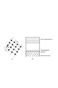 Введение в четырехатомную решетку германия трехвалентного индия создает другой тип полупроводника. Три валентных электрона не могут обеспечить ковалентные связи с четырьмя атомами германия, и одна связь остается незаполненной. Однако один электрон может перейти в эту связь, а на его место другой соседний и т.д. Следовательно, вакансия электронов подвижна и может передвигаться по решетке. На зонной диаграмме (рис.2.9, б) примесь индия приводит к появлению локальных незаполненных уровней вблизи валентной зоны (0,01 эВ), на которые могут перейти электроны под действием внешнего возбуждения, причем в валентной зоне образуются дырки, обеспечивающие механизм электропроводности. Подобные уровни – акцепторные, а полупроводники – дырочные, или р-типа.