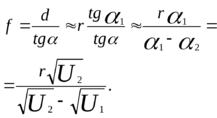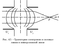 При любом соотношении потенциалов линза собирающая. Преобладает собирающее поле над рассеивающим, ибо электрон первое поле проходит с меньшей скоростью, большее время подвергается действию электрического поля и сильнее отклоняется, чем во втором. Собирающее действие иммерсионной линзы (f) зависит от
