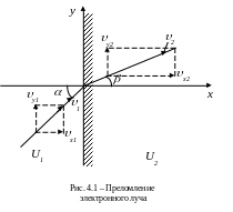 При движении электрона через границу двух сред с различными потенциалами (рис. 4.1) составляющая скорости, параллельная поверхности раздела, остается без изменения, а составляющая, перпендикулярная этой поверхности, изменяется по величине (увеличивается при U2 > U1 ).