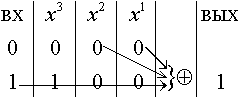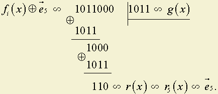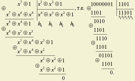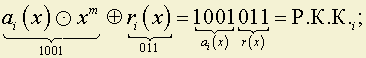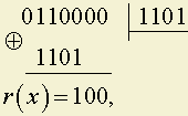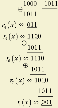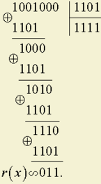 из полученного m-разрядного числа вычитаем g(x); в нашем случае это равносильно сложению по модулю два в тех старших разрядах, в которых стоят единицы за исключением старшего разряда x3, так как у него в результате сложения всегда получаем ноль;