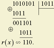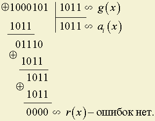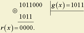 На приемной стороне, чтобы судить есть ошибка или нет, необходимо принятую кодовую комбинацию (К.К.) поделить на g(x). Если ошибок нет, то остаток от деления r(x) должен быть равен нулю. Делим: