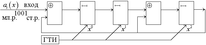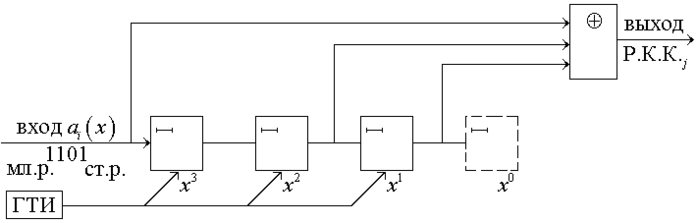 Ячейка x0 не нужна, а потому показана пунктиром. Входной сигнал подается в ячейки памяти слева, начиная со старших разрядов. Входной сигнал по тактам продвигается по ячейкам памяти в соответствии с частотой генератора тактовых импульсов (ГТИ). За один такт продвигается вправо содержание всех ячеек памяти одновременно. На выходной сумматор по модулю два поступают синхронно те нули и единицы, которые идут в соответствующие ячейки памяти. В нашем случае это x3; x1 и x0, то есть ячейки, соответствующие наличию единицы в записи g(x) = 1011 = x3 Е x Е 1. Сигнал, поступающий в ячейку x2, на сумматор не идет.