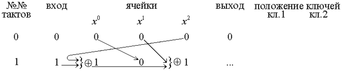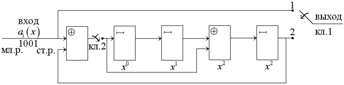 В начальном положении кл.1 в положении 1 и все входные сигналы ai(x) идут на выход. Ключ 2 в положении замкнут и в регистре сдвига идет деление, начиная с первого такта. На k-том такте информационные символы заканчиваются и в ячейках памяти должен образоваться остаток ri(x). В этот момент ключ 2 размыкается, обратная связь от ячейки x2 разрывается, а ключ 1 переходит в положение 2 и остаток ri(x) приписывается к ai(x).