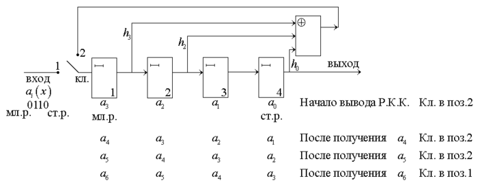 на всех j, на которых hj = 1, и суммирование результатов умножения по всем hj = 1 с получением проверочного символа и занесением его в освободившуюся ячейку регистра сдвига. Так происходит m тактов. Ключ возвращается в позицию 1 и начинается ввод новой кодовой комбинации ai(x).