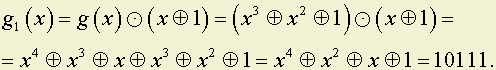 Образующий многочлен, исправляющий одиночные и двойные смежные ошибки, получается путем умножения образующего многочлена, исправляющего одиночные ошибки на (x Е 1) (см. 6.3.6.). Если у нас в предыдущем примере многочленом, исправляющим одиночные ошибки, был g(x) = x3 Е x2 Е 1, то в качестве многочлена, исправляющего одиночные и двойные смежные ошибки, выбираем многочлен: