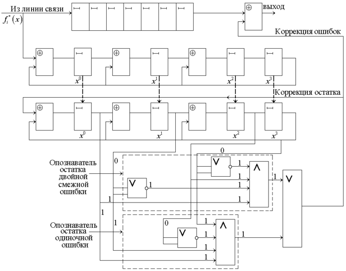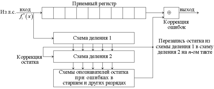 Пусть имеет место ошибка в старшем разряде К.К., принятой из линии связи. Пока она доберется до выхода из приемного регистра, все n тактов она делится в схеме деления 1. На n-ном такте остаток переписывается в схему деления 2. На (n + 1) такте ошибка выходит из регистра и поступает на сумматор. Одновременно из схемы деления 2 кодовая комбинация, соответствующая ошибке в старшем разряде, поступает на схему опознавателя остатка ошибки в старшем разряде. Последняя вырабатывает сигнал на исправление ошибки и обнуление схемы деления 2, если других ошибок нет. Если же ошибка имеет место не в старшем разряде, то остаток, переписанный из схемы деления 1 в схему деления 2, продолжает делиться до тех пор, пока ошибка не доберется до выхода из регистра, то есть в обеих схемах деления 1 и 2 ошибка будет всегда делиться n раз.