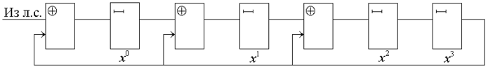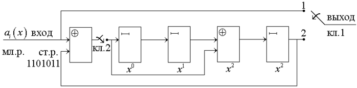 1. Выберем схему деления. Пусть это будет схема деления с m-ного такта, то есть g(x) = 10111; имеем:
