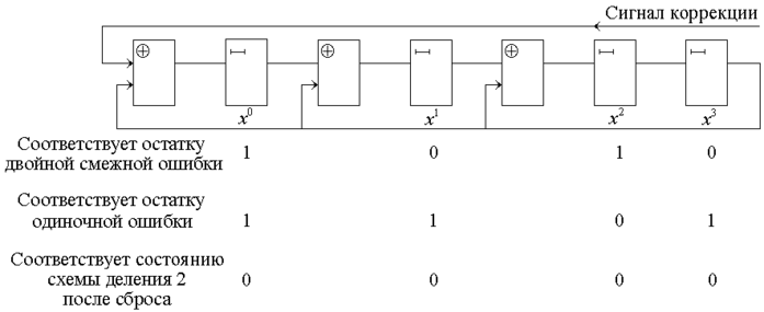 Итак, для исправления двойной смежной ошибки необходимо находить остаток 0101, а для одиночной ошибки – 1011. Если бы построили схему деления с первого такта, то остатки были бы другими: 1000 и 1100.