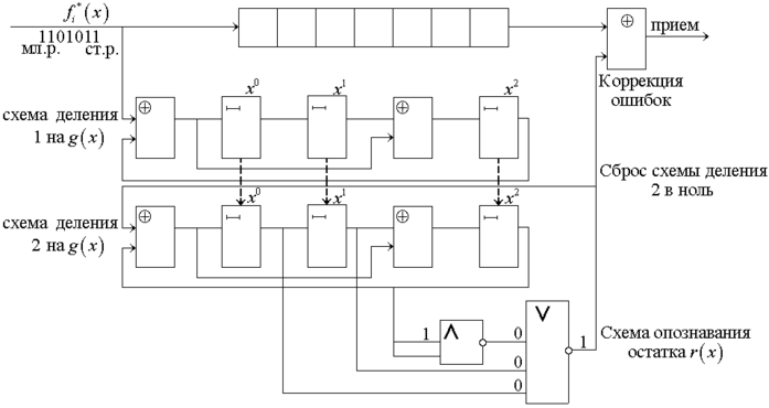 | 1 | 1 | 1 | 0 | 1 | – | Идет заполнение приемного регистра и деление ƒi*(x) на g(x) в схеме деления 1 |