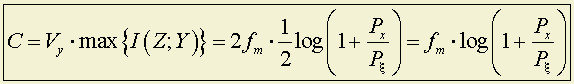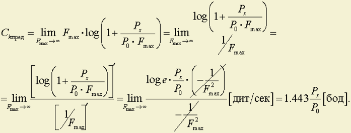есть предельная скорость передачи информации по каналу со сколь угодно редкими ошибками. Достигается путем применения сложных методов преобразования и кодирования. Передаваемый сигнал должен быть – "белым шумом" – некоррелированный, т.е. имеющий равномерный энергетический спектр.