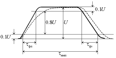 4. При передаче трансцоидального импульса происходит его искажение. Чаще всего это сглаживание (показано пунктиром). На рис. 10.18. показаны длительность импульса и длительности фронтов (переднего и заднего). Из приведенных соотношений видно, что для сохранения фронтов требуется значительно более широкий спектр, чем для передачи основной энергии импульса.