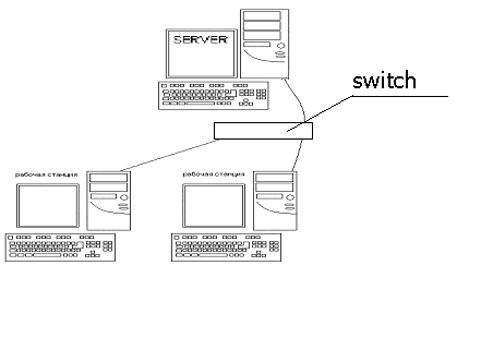 Рассмотрим сеть ЦДП. Построим её на витой паре . Сетевые карты интегрированы в материнские платы рабочих станций и сервера. Сеть будет выглядеть следующим образом.
