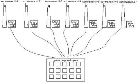 Сервер и 2 рабочие станции. . В каждой котельной должны быть установлены 1 рабочая станция для сбора и передачи информации на диспетчерский пункт. Поток информации о каждого котла 200 4-х байтовых сигналов плюс 100 общестанционных сигналов. Число котельных от 2 до 5.