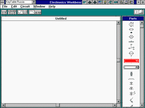 Верхняя строка -строка главного меню. Во второй строке располагаются пиктограммы электронных приборов, которые можно «захватить и перетащить мышкой» в окно для рисования схемы моделируемой цепи. В этой же строке справа располагается символ включателя для старта или прерывания процесса моделирования. Элементы схемы извлекаются аналогичным образом из окна Parts. Схемное окно и окно Parts имеют горизонтальную и вертикальную «линейки прокрутки» для вывода на экран различных фрагментов окон.