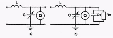 Рис. 1.3. Принципиальная схема измерительного колебательного контура куметра без подключенного образца (а) и с подключенным образцом (б)
