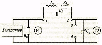 Измерение индуктивности Lx с учетом емкости CLx производят на двух резонансных частотах, которые можно вычислить следующим образом: