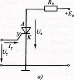 На рис. 9.8 представлены соответственно схема включения (отметим, что потенциал питания — Еа, как и в транзисторных схемах, обозначают корпусом — землей) и ВАХ тринистора.