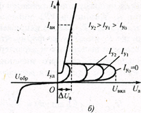 Регулировку тока, протекающего через тринистор и нагрузку, осуществляют с помощью цепи управления. Если ток в цепи управления Iу0 = 0 (рис. 9.8, л и б), то включение тринистора происходит при анодном напряжении Ua ≥ Uвкл называемом напряжением включения. Это напряжение достаточно велико (десятки вольт), и его можно снизить путем подачи в цепь управления импульса тока управления Iу > Iу0, влияние величины которого на работу тринистора видно из его вольт-амперной характеристики на рис. 9.8, б.