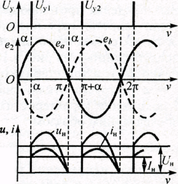 На рис. 9.9 показаны схема управляемого выпрямителя с активной нагрузкой Rн и временные диаграммы токов и напряжений, поясняющие принцип его действия.