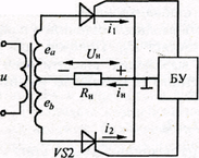 Тринисторы VS1 и VS2 в схеме (см. рис. 9.9, а) открываются поочередно при поступлении на их управляющие электроды импульсов управления с блока управления (БУ). Временное положение импульсов управления Uy1 и Uy2 по отношению к фазным напряжениям еа и ев определяется углом управления (регулирования) а (см. рис. 9.9, б, в). Угол управления α соответствует задержке по фазе момента включения тринистора относительно естественного момента открывания выпрямительного диода, если он включен в схему вместо тринистора. При угле α = 0 управляемый выпрямитель становится неуправляемым. Тринистор VS1 включается в момент времени, когда фазовый угол v = α, и в момент времени, соответствующий углу v = π, выключается. На этом интервале к нагрузке Rн практически напрямую подключается фазное напряжение еа, и через нее протекает ток i1. Тринистор VS2 проводит ток на интервале (π + α)...2π, подключая к нагрузке Rн фазное напряжение еb,. Выпрямленный ток iн на активной нагрузке RH имеет ту же форму, что и напряжение uн (см. рис. 9.9, г).