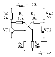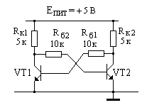| Дано: VT1, VT2 -Si, =50, IК0= 0,1мкА Рассчитать: пороги срабатывания, потенциалы К1, К2. Привести осциллограмму Uвых в случае, если |
