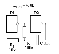 | Дано: D1D2 ЛЭ КМОП К561ЛН2, ЕПИТ =10В. Нарисовать осциллограммы в характерных точках, вычислить период и амплитуду колебаний. |