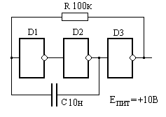 | Дано: D1D3 ЛЭ КМОП К561ЛН2, ЕПИТ =10В. Нарисовать осциллограммы в характерных точках, вычислить период и амплитуду колебаний. |