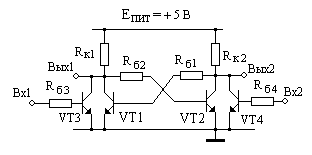| Дано: VT1=VT2=VT3=VT4=Si, =50, IК0=0,1мкА. RК1= RК2=5к, RБ1=RБ2=RБ3=RБ4=15к. Дать схемы замещения транзистора: 1) в насыщен-ном состоянии, 2)в отсечке Опр: К1, К2, Б1, Б2. Опр: ВЫХ1, ВЫХ2=f(ВХ1, ВХ2)., Составить словарь переходов. |
