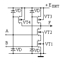 | Дано: EПИТ =+9 В, UО1 = UО2 = 3В, UО3 = UО4 = 4В, bn = 0,1 мА/B, bp = 0,2 мА/B. Опр: U1, U0 , вывести логическую функцию, выполняемую схемой. | |
