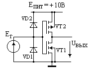 | Дано: VT1,VT2=Si, b1=5мА/В2, b2=5мА/В2 U01=2В, U02=3В. Опр: UВЫХ, IПИТ = f(ЕГ), |