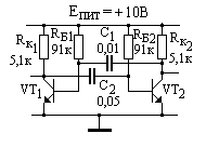 | Дано: VT1, VT2 -Si, =50, Рассчитать и привести осцилло-граммы К1, К2, Б1, Б2 (t). Вычислить полупериоды колебаний. | |