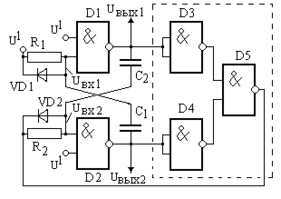| Дано: D1D5 ЛЭ КМОП К561ЛА7, ЕПИТ =10В, VD1=VD2=Si. R1=50к, R2=100к, C1=C2=0,01мкФ. Нарисовать осциллограммы в характерных точках, вычислить период и амплитуду колебаний. |