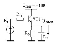 | Дано: VT1-Si, =50, Iк0=0,1мкА, RЭ=1к, RБ= 5к, СКБСЭБ0, CН=0,01мкФ, =10-10с. Опр: UВЫХ, = f(t), если ЕГ =5В = идеальный прямоугольный импульс. |