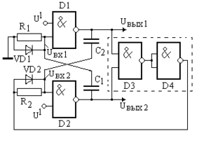 | Дано: D1D4 ЛЭ ТТЛ К155ЛА3, ЕПИТ =5В, VD1=VD2=Si. R1=R2=1к, С1=0.3мкФ, С2=0,1мкФ. Нарисовать осциллограммы в характерных точках, вычислить период и амплитуду колебаний. |