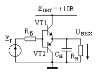 | Дано: VT1, VT2=Si, =50, Iк0=0,1мкА, RН=1к, RБ= 5к, СКБСЭБ0, CН=0,01мкФ, =10-10с. Опр: UВЫХ, = f(t), если ЕГ =10В = идеальный прямоугольный импульс. |