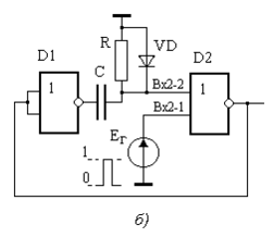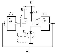 В этой схеме для обеспечения устойчивого (ждущего) состояния на оба входа ЛЭ D2 должен поступать высокий потенциал U 1, при этом на входе ЛЭ D1 возникает уровень U 0. Данная схема запускается отрицательным перепадом Eг (от U 1 U 0) по входу 2-1 и позволяет получить на выходе ЛЭ D2 импульс положительной полярности, близкой по форме к прямоугольной. Длительность генерируемого импульса определяется по формуле