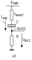 – резистор – шина нуле-вого потенциала (показано пунктиром на рис.3.1, а). Эквивалентная схема заме-щения для расчета пере-ходного процесса и осциллограмма напряжения на входе ЛЭ D2 представлены на рис.3.2.