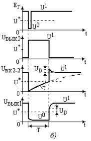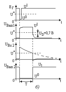 После квазиравновесной следует стадия восстановления, в течение которой в схеме происходит восстановление потенциалов и токов до первоначальных значений. Перезарядка конденсатора C через резистор R (Iраз) существенно увеличивает время восстановления. Для сокращения этой стадии в схему (см. рис.3.1, а) вводят диод VD. В течение квазиравновесной стадии диод закрыт, а на этапе восстановления он открывается и конденсатор C разряжается не через резистор R (показано пунктиром), а через выходную характеристику ЛЭ D1 и диод VD. Это существенно ускоряет процесс восстановления, однако несколько увеличивает длительность заднего фронта импульса напряжения на выходе ЛЭ D1. На рис.3.1, б представлены синхронизированные по времени осциллограммы в характерных точках одновибратора. Видно, что импульс на выходе ЛЭ D2 имеет форму, близкую к прямоугольной, и его полярность соответствует перепаду напряжения от U 1 к U 0. Импульс на выходе ЛЭ D1 положительный, однако имеет искажения как вершины, так и заднего фронта, что связано с падением напряжения на ЛЭ D1 от тока перезаряда конденсатора C.