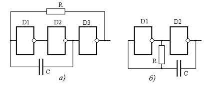 Мультивибратор является релаксационным автогенератором, обычно имеющим два квазиравновесных состояния. В течение квазиравновесной стадии в схеме идет относительно медленный процесс перезарядки конденсаторов, который в конечном итоге приведет к появлению скачка токов (напряжений), и схема переходит в другое квазиустойчивое состояние и т.д. Мультивибратор с одним времязадающим конденсатором наиболее часто строят на основе двух или трех инверторов, для чего у логических элементов (ЛЭ) И‑НЕ или ИЛИ‑НЕ все входы объединяют. Входы, оставшиеся свободными, могут быть использованы для управления автогенератором для включения или выключения его. Наиболее характерные схемы представлены на рис.4.1.