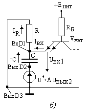 При достижении Uвх1=U* в схеме возникает положительная обратная связь, приводящая к скачку – "опрокидыванию" MB. Процесс опрокидывания очень короткий, и его длительность учитывать не будем. Положительный скачок напряжения Uвых2 с выхода ЛЭ D2 через емкость C будет передан на вход ЛЭ D1 и создаст потенциал Uвх11 = Eпит +UD. В результате на выходе D1 формируется уровень низкого потенциала, на выходе D2 - высокого, на выходе DЗ – низкий потенциал. Конденсатор C теперь будет перезаряжаться в соответствии со схемой, показанной на рис. 4.3, б. Этим процессом будет определяться длительность второй квазиравновесной стадии периода колебаний T2: