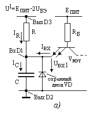 Синхронизированные по времени осциллограммы в характерных точках MB представлены на рис.4.3, в. Необходимо помнить, что входы ЛЭ КМОП защищены охранными диодами VD1, VD2 (см. "Приложение", табл. П.1). Именно поэтому напряжение на входе Вх1 не может быть больше, чем | Eпит +UD|, и меньше, чем –UD. Наличие охранных диодов приводит в момент переключения к появлению значительных токов диодов VD1, VD2, а также тока выхода ЛЭ D2, что связано с процессом заряда емкости C. Это увеличивает длительность переднего и заднего фронта импульса на выходе ЛЭ D2.