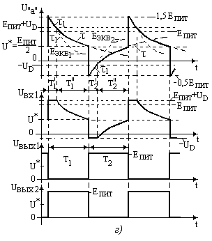 | Рис. 4.3. Путь тока I в процессе заряда конденсатора C при формировании периодов T1 (а), T2 (б), осциллограммы в характерных точках (в) | |