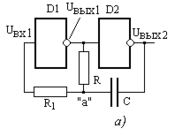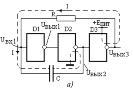 Рассмотрим характерные моменты работы MB (рис. 4.3). Пусть в исходном состоянии потенциал на входе ЛЭ D1 имеет низкое значение Uвх0= – 0,7 В (рис.4.3, в). В этом случае на выходе инвертора D1 формируется высокий потенциал Uвых1= U 1, на выходе инвертора D2 – низкий потенциал Uвых2= U 0, на выходе ЛЭ DЗ – высокий потенциал U 1.