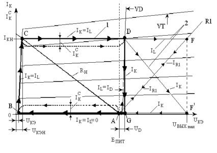 | Рис. 3.2. Перемещение рабочей точки по семейству выходных характе-ристик транзистора: 1– в отсутствии резистора R1, 2 – при наличии резистора R1 (начиная с точки D). |