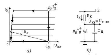 Рассмотрим другой крайний случай, когда емкость СН велика. Емкость СН велика так, что время перезарядки этой емкости существенно больше времени включения и выключения транзистора. В этом случае можно считать, что транзистор включается и выключается мгновенно. Допустим, что в исходном состоянии транзистор заперт. На выходе сформирован высокий уровень потенциала, и емкость CН заряжена до напряжения EК. При подаче на вход ключа отпирающего сигнала EГ+ транзистор через время задержки (tЗД) откроется, и в цепи коллектора установится ток 0IБ+. Поскольку напряжение на емкости СН мгновенно измениться не может, рабочая точка на семействе выходных характеристик (рис. 2. 5, а) переместится вертикально вверх, и емкость СН будет разряжаться постоянным током 0IБ+.