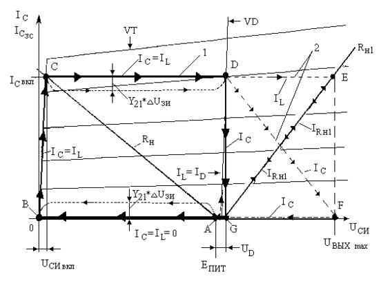 Необходимо обратить особое внимание, что в момент окончания формирования фронта t0-1 рабочая точка транзистора находится в положении “D” (Рис. 4.5 ) – через транзистор протекает максимальный ток и одновременно - напряжение UСИ максимальное. На транзисторе выделяется максимальная мощность, что может привести к выходу его из строя!