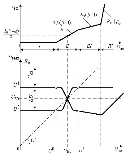 Рассмотрим передаточную и входную характеристики схемы (рис. 6.2) и выведем основные количественные соотношения, характеризующие ее работу. При анализе будем считать транзисторы идеально одинаковыми, а напряжение между эмиттером и базой открытого транзистора не зависящим от тока эмиттера и равным U* 0,7В. Характеристики схемы можно разделить на четыре участка (от I до IV), на каждом из которых транзисторы VT1 и VT2 находятся в определенном режиме. Из группы входных транзисторов VT1 будем рассматривать лишь один, считая остальные закрытыми (на их входах приложен низкий потенциал).