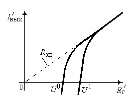 Выходные характеристики (рис. 6.3) представляют собой две ветви, соответствующие низкому UК0 и высокому UК1 напряжению на коллекторе транзистора VT1 или VT2. При напряжении выше напряжения логических 0 и 1 эти ветви сливаются в одну прямую с наклоном, определяемым сопротивлением RЭП,, поскольку транзистор эмиттерного повторителя закрыт. При низком напряжении транзистор открывается и выходной ток уменьшается.
