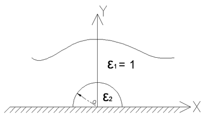 1. Рассчитать и построить профиль электрода, обеспечивающего создание однородного поля в полусферическом теле. Напряжение на электроде относительно плоской поверхности U0. Пробивная напряжённость электрического поля в воздухе E1max=3000 кВ/м, а в материале полусферы E2max=6000 кВ/м. Определить расстояние от проводящей плоскости до электрода на оси Y (при X=0, z=0), при котором произойдет пробой.